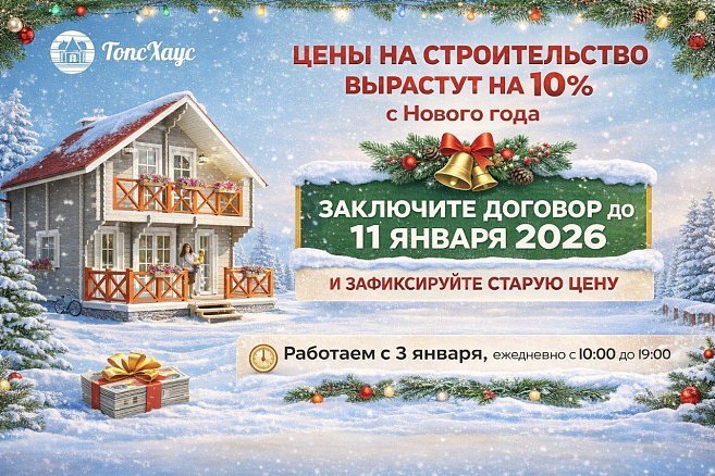 Скидка 10% на домокомплект на все строения, кроме бань, бытовок и теплых домов. Срок проведения акции с 31.12.2025 по 11.01.2026
